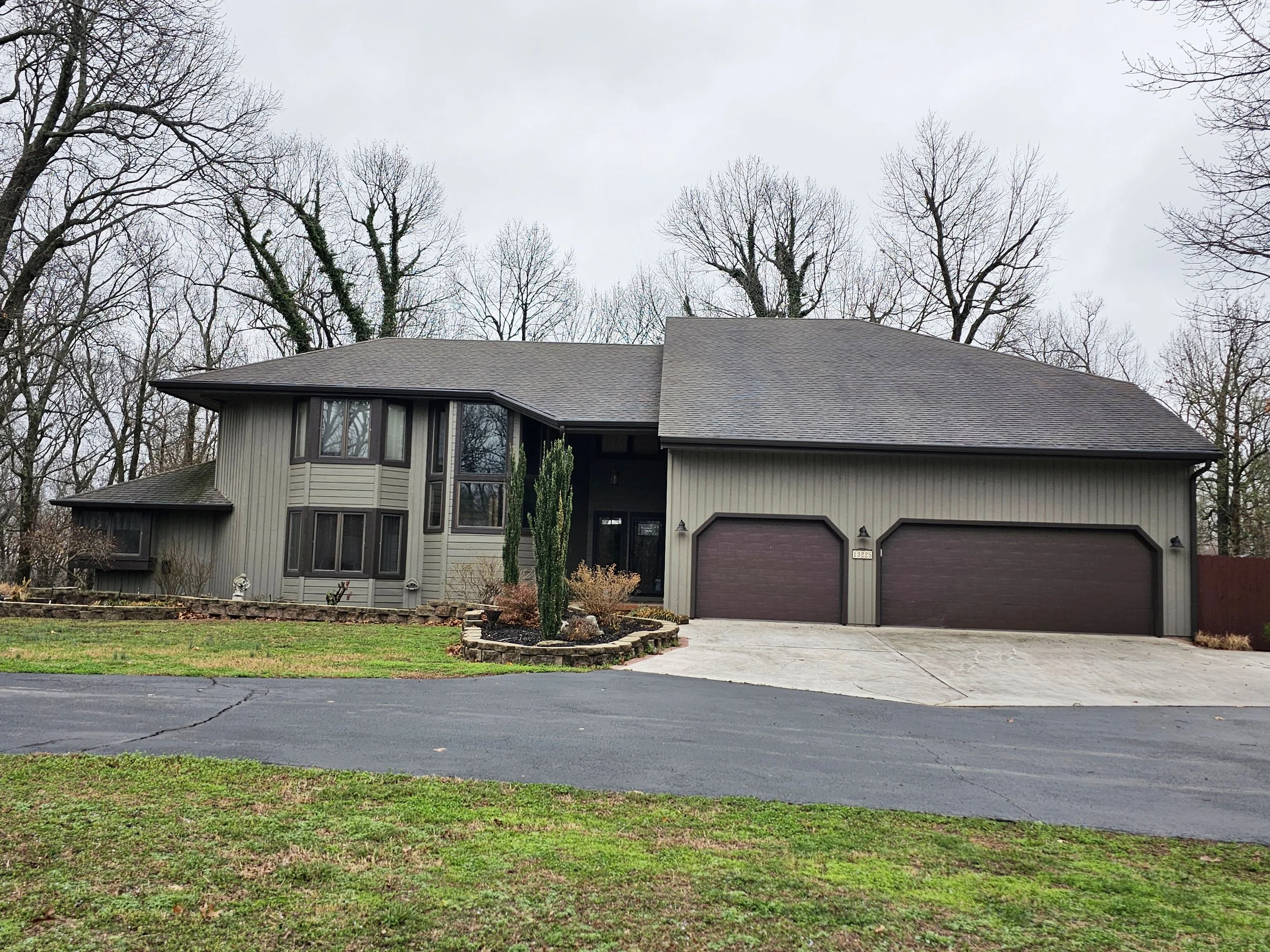 Discover the perfect blend of rustic charm and modern luxury in this unique two-story home, nestled on three breathtaking acres. As you step inside, you are greeted by a semi-open floor plan that is both grand and inviting, designed for seamless entertaining and comfortable everyday living. The heart of the home is a magnificent 25-ton Arkansas stone fireplace, a true masterpiece that radiates warmth and character throughout the formal living area, dining space, and cozy den.